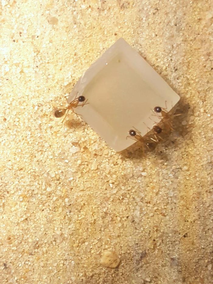 Сироп заливаю на ночь, так как днем муравьи не активны. Кстати это очень важный факт-" муравей ночной" и при выборе его в коллекцию, это необходимо учитывать. При свете солнца, вы их не увидите на арене. Хотя опять же, не могу утверждать, что будет при изменение численности. Но это узнаем в дальнейшем. Вся еда уносится в инкубатор, оттуда выходят лишь сухарики, но и в инкубаторе есть мусор у ватки, так что возможна плесень.