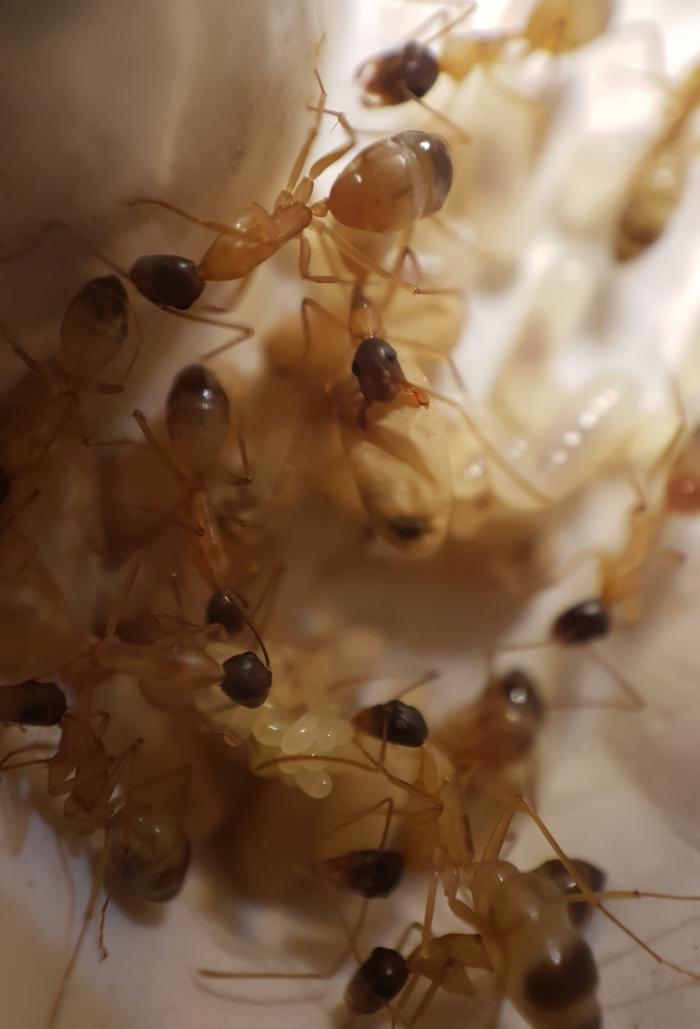 Четверо маток, через пару дней, одна за другой, отложили по нескольку яиц. Но ухаживали за расплодом, только две матки, другие две отнесли расплод к сухой части инкубатора и оставили их там, сами же вернулись в ватке. Хотя условия содержания, размеры инкубаторов и прочие факторы были идентичными. По прошествию еще нескольких дней, одна из маток, что оставили расплод, стала просидать на задние лапки, это была первая весточка, что, что-то не так... через сутки, я нашел трупик. Еще несколько дней, такая же история повторилась со второй маткой, оставившей расплод. Грешу конечно, на то, что на палубу они могли попасть вечером или ночью и провести на ней много времени, а так как это не прогулочный катер, то на палубе много гадости, химии и прочих прелестей жизни грузового судна. Но оставались еще две матки и на вид они были довольно здоровыми, хотя аппетитом отличались. Одна из них активно кушала сироп, но только в ночное время, поэтому я капал горошинку сиропа ( с голову муравья) ближе к полуночи и на утро находил два разных результата. Одной горошинки и след простыл, а вторая оставалась не тронутой. Но как говориться, - на вкус и цвет... Результат дал о себе знать через неделю. Утром я нашел ещё одну матку, отбывшую в муравьиный рай. Расплод решил переместить к оставшейся матке! Благо новая мама приняла его, как свой собственный.