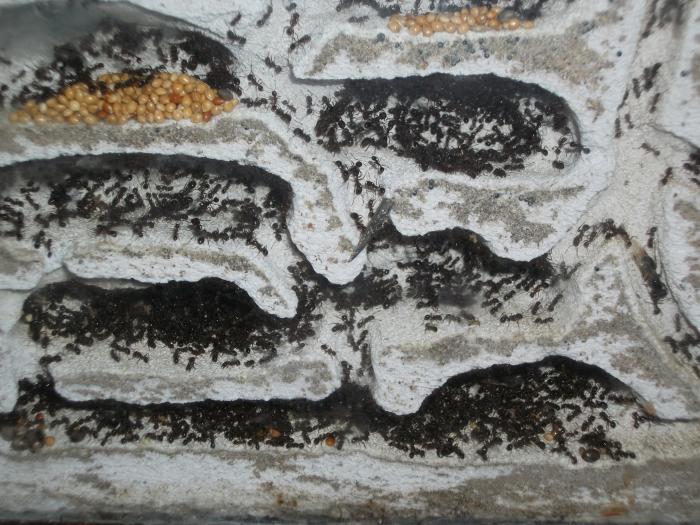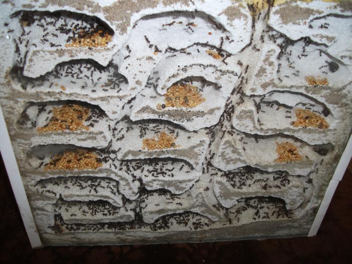Много лет эксплуатирую пару итонговых с жнецами, размеры 300х100х250 мм. Камера увлажнения внизу и на нижних этажах держат расплод, вверху суше, там зерно. Материал понравился, хорошо обрабатывается, но и грызется тоже хорошо, поэтому все в стеклянном корпусе.