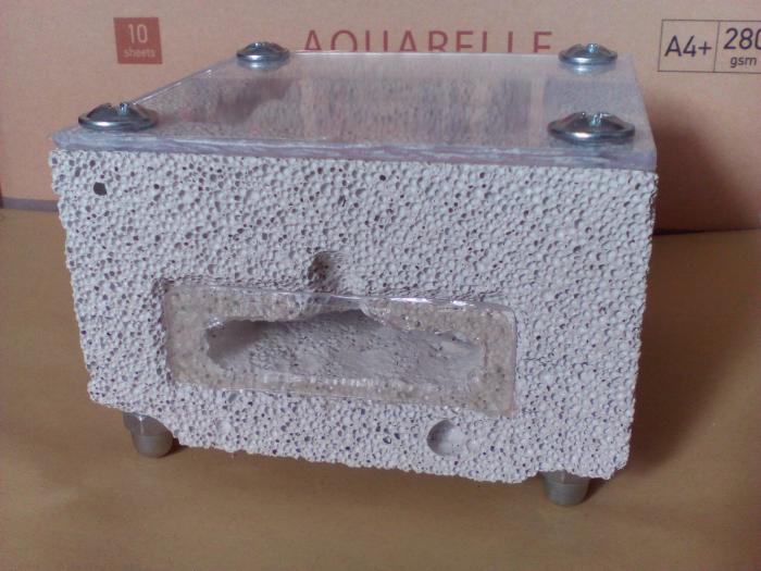 оргстекло (поликарбонат), аквариумный силикон, гипс, 9х8х2,5 см. От встроенной арены отказался, сделал крепеж под пищевые ПНД контейнеры.