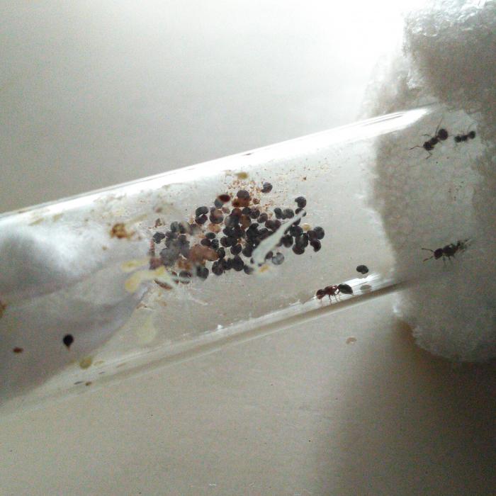 Meranoplus bicolor - первый на моей памяти муравей, который бежит внутрь пробирки в полном составе колонии, когда я вытаскиваю вату.