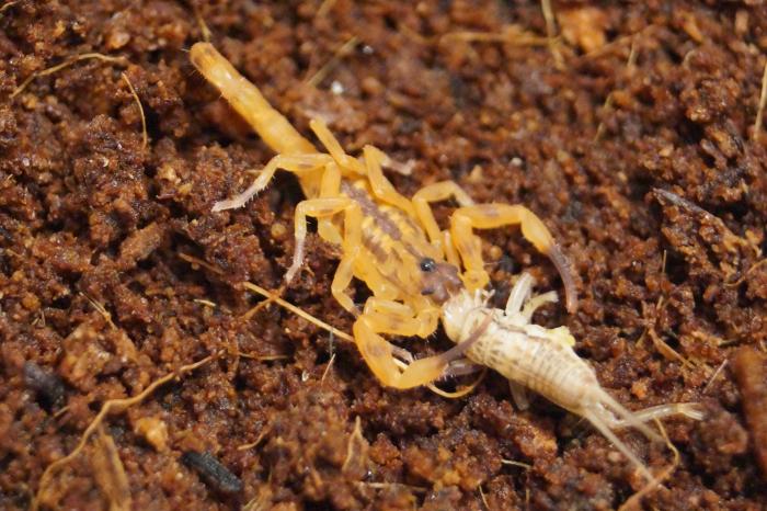 Молодая самка Tityus serrulatus продолжает есть таракана, нисколько не смущаясь тем, что я её фотографирую.