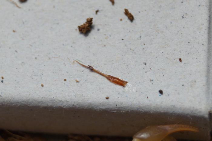 Кстати, субстратом для сперматофора здесь служил кусочек спичечного коробка в котором, собственно, и приехала самка. Как ни странно, но этот субстрат оказался очень удобным и скорпионам и мне, ибо сперматофор на белом фоне превосходно видно. В дальнейшем попробую отлить для подобных нужд плиточки из гипса.