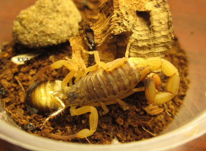 Как и всегда в выходные, я сегодня кормил животных. Первыми на очереди были Hottentotta hentili, несколько из которых, к тому же, перелиняли в последний 7 раз. Один из них, схватив таракана, опёрся на стенку садка и, будучи доволньо массивным, перевернул контейнер, полетев вместе с ним на пол.