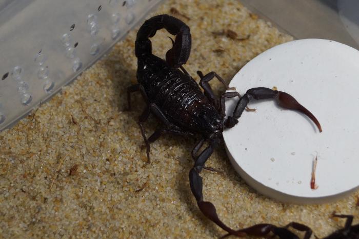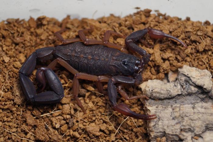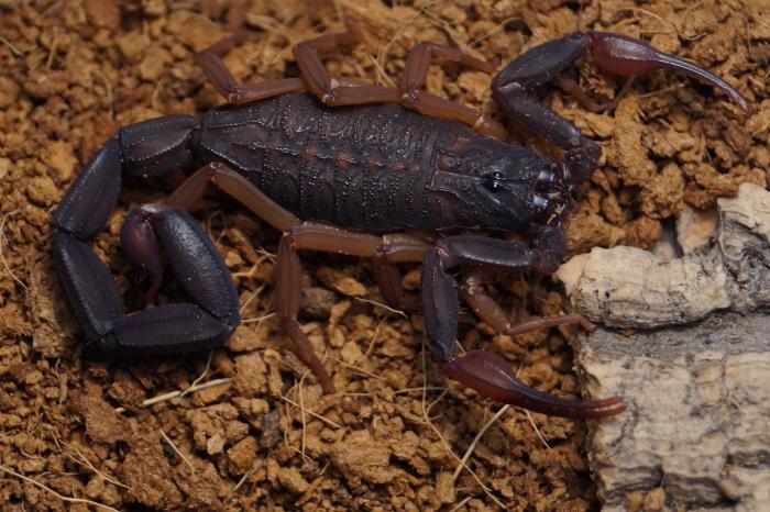 Во-вторых, этот вид номинируется на звание самой крупной бутиды. Размер 12-13 см для этого вида не редок, а бывают исключения длиной до 15 см. То есть это шикарный, бархатисто-черный скорпион размером с гетерометруса но при этом как бы изящный, красивый и токсичный.