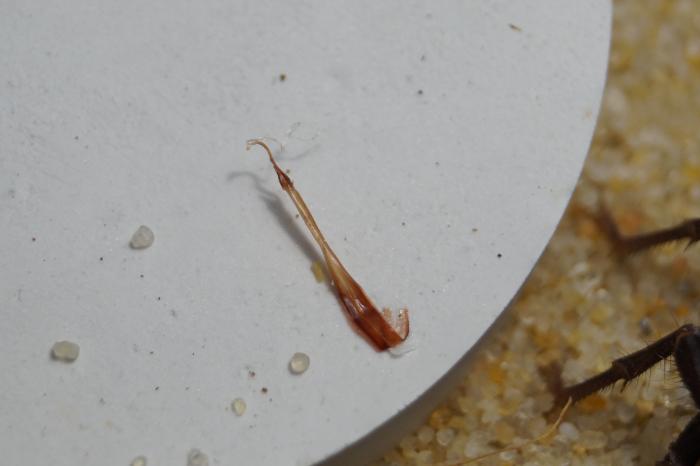 Кстати, то, что скорпионы живут в пробирках нисколько не повлияло на качество линек. Единственное опасение было что скорп начнет линять на стекле и не сможет выползти из не зафиксированной шкуры. Но опасение не оправдалось, т.к. один из них действительно начал линять на стекле, но тем не менее благополучно вылез из шкуры с помощью мышечных сокращений.