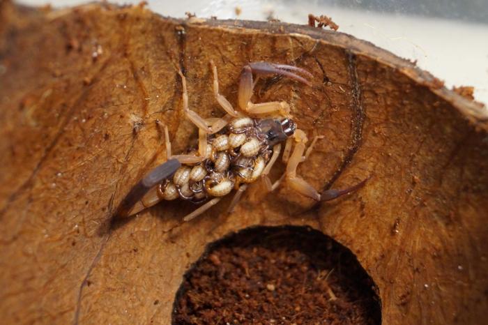 Ура, товарищи! Нежданно-негаданно родила самка Lychas scutilus. Я подозревал, что она беременна, но точно утврждать не мог, ибо как такового спаривания, как и сперматофора, я не видел, ведь после подсадки самец не сразу приступил к делу, а сперматофор самцы лихасов почти всегда сьедают сразу после спаривания.