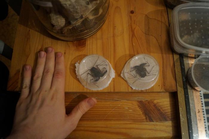 Поселить я фринов решил вместе ибо они довольно социальные и в природе живут в полых стволах деревьев большими колониями. Но дабы у них не было соблазна ненароком зажевать собрата я выпустил в террариум около 30 тараканов, чтобы покушать всегда было под лапой.