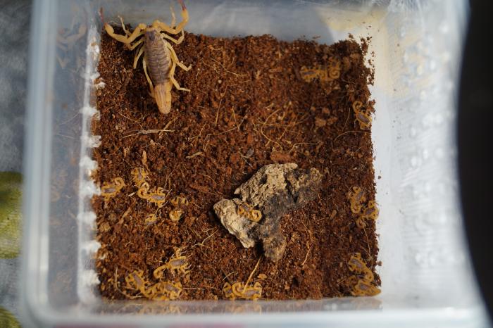 Сегодня утром, после того как написал про титиев начал собираться на учебу. Оделся, собрался и уже готовлюсь выходить как замечаю, что родила самочка Mesobuthus eupeus. Пришлось в срочном порядке делать ей влажный угол.