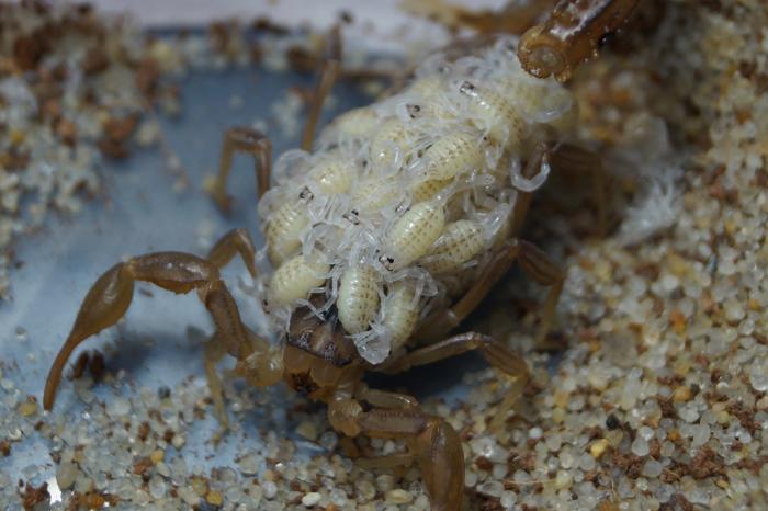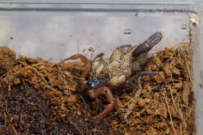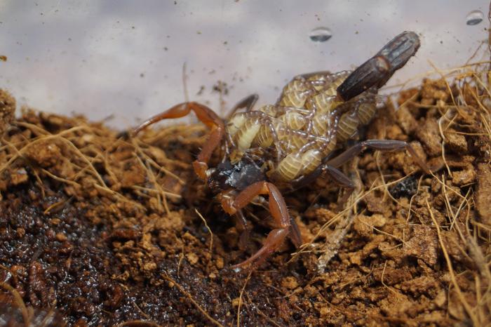 Снова родила самочка Mesobuthus eupeus и, как всегда, неожиданно и довольно скоро.