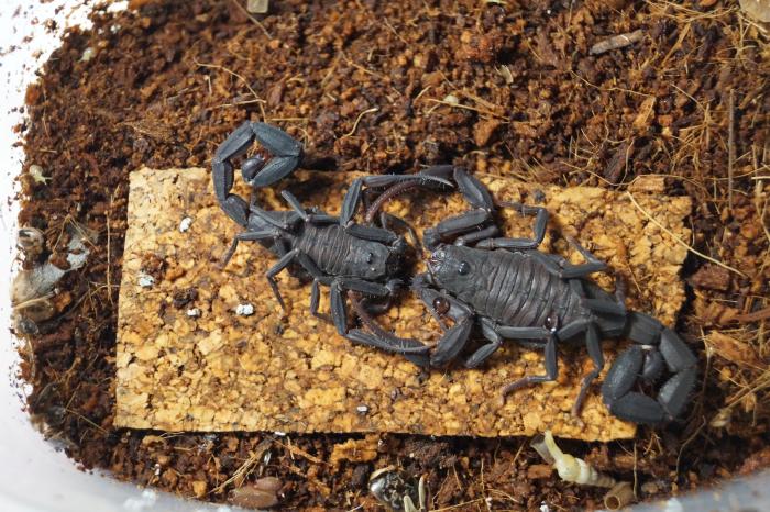 Пару месяцев назад друг принес мне свою самку Lychas scutilus на спаривание. Но поначалу, я подумал что она не адультна и даже ссаживать не стал, ибо она была ровно в 2 раза мельче моей самки. Но время школ, она все не линяла и вот я, совершенно спонтанно, решил подсадить к ней самца.