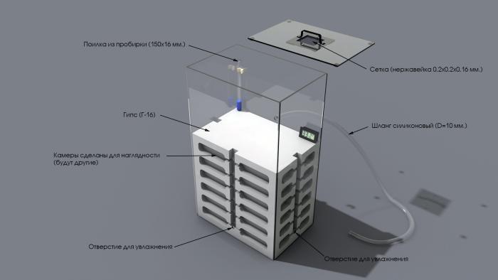 Увлажнение будет путем наливания из шприца в камеру (у которой не будет доступа мурашам) отверстия показаны на картинке (с трёх сторон).