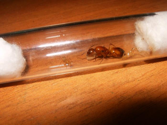 Во-первых, пришлось экстренно переселять муравьев из старого дома в новый, так как старая пробирка начала плесневеть. Мурашей я переселил, но из-за стресса они съели яйца, и теперь, из расплода только 1 яйцо. После переселения, матка стала очень агрессивно себя вести, кидалась на все что попадало в пробирку, и прыскала каким-то веществом из брюшка, которое при попадании на руку оставляло красное зудящее пятно. В первый день после переселения, они отказывались от всех видов пищи ( сироп, белок), но сейчас. все уладилось и они снова активно питаются.