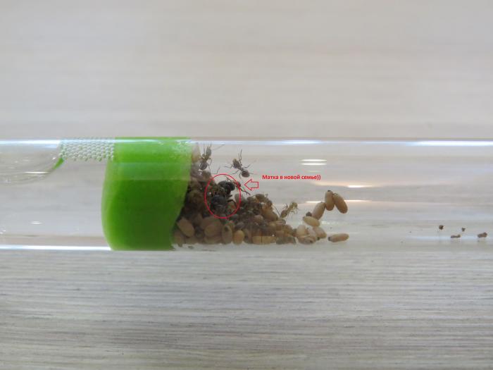 Да, каждую семью переселил в новый инкубатор. Переселение велось методом принудительно-принудительный. Т.е. бралась баночка для анализов, края самзал тальком со спиртом (получилось идеально, нигеры не прошли, хотя активно старались), подключался инкубатор, затемнялся и семья выталкивалась на арену. А затем сами забирались в новый инкубатор. Часть личинок пропала, я их вытаскивал спицей, но часть раздавил. Тех, кого достал целыми, можно сказать пихал в мандибулы рабочим, чтобы о них позаботились. Когда все забирались в пробирку, она отсоединялась от арены и затыкалась ватой
