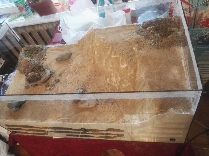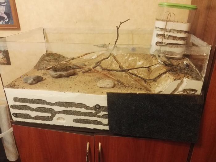 Добавил на аруну песка, камушкав, мха, веточек, думаю им так будет лазеть поинтереснее)