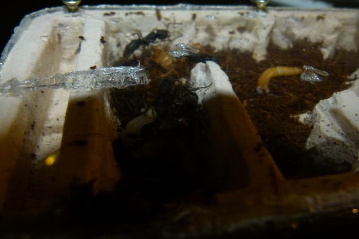 Про кормление.По приезду домой семейка игнорила всех туркменов и прочих тараканов. Зато с лихвой налегали на мучного червя. Сегодня же они едят исключительно сверчков И ИСКЛЮЧИТЕЛЬНО ЛАПКИ С ГРУДКОЙ, ну и иногда туркмена погрызут. Состав колонии теперь 9 муравьев, 10-12 яиц, две личинки и два кокона.