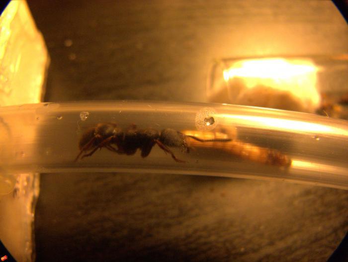 Каким бы страшным формик не казался но пожарники им пока довольны. Как я писал раньше это была весьма не удачная временная мера. Но когда новый формик был готов, пахикондилы одарили меня новой кладкой, бурным ростом трех личинок, вскрытием старого кокона и оплетением двух новых личинок. Желание их переселять сразу отпало. При детальном изучении колонии обнаружил матку (которая кстати еще и яйца откладывает). И вот то-ли уже глаз набил, то-ли мне так повезло. Но матка явно выделяется на фоне остальных особей. Я имею ввиду размер. Удалось мне и знаменитую струю пены увидеть. Это произошло при очередном кормлении муравьев внутри гнезда. Задев муравья кусочком сверча от окатил пинцет тонкой НИТОЧКОЙ пены. Кстати пена еще и пахнет как жук знахаря. ( И по секрету... Она еще и на вкус горькосоленокисловатая. Не спрашивайте меня откуда я это знаю... Просто поверьте)))).