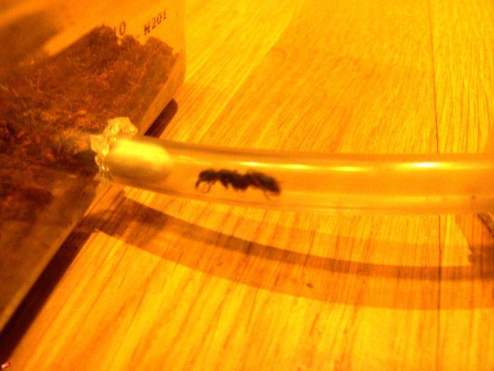 На следующий день, в почти назначенный час я направился к месту встречи. И вот пробирка у меня в руках... O.M.G. Какие они огромные. Наверное это обычная реакция тех кто видит таких муравьев впервые в живу. Немного поболтав, я пихнул пробирку в карман, зажал ее в руке и пулей помчался к метро. Очень переживал. В тот день еще и мороз стукнул, плюс светофоры сговорились. И вот я дома. Дав моим новым соседям оклематься я не долго думая подключил пробирку к формику. Этот процесс я снимать не стал. Перешли без проблем, буквально минут за 15. Расположили личинки, кокон и яйца так, словно они всю жизнь жили в этом формике. Всего получилось 8 муравьев, 5-7 личинок и пакет яиц. Подключил арену и предложил три вида корма. Сверчка, мучняка и туркмена. Мучняка утащили сразу в гнездо, а туркмена и сверчка проигнорили. Кстати, муравьи ехали из Тольятти, а потом еще и до дома добирались около четырех часов. И после такого стресса ни одна личинка, ни одно яйцо не пострадали.