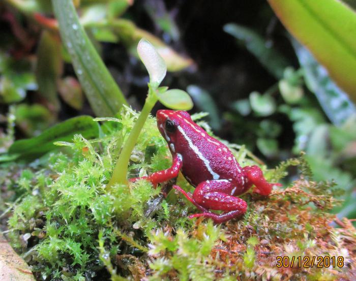 Взрослый древолаз Энтони (Epipedobates anthonyi) под проростком Hydnophytum formicarum