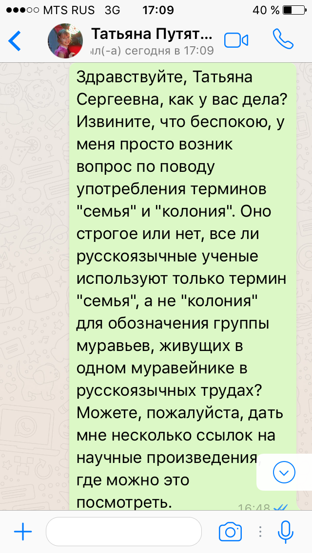 Друзья, если не верите мне, то ссылаюсь на переписку с Путятиной Татьяной Сергеевной, которая является кандидатом биологических наук, старшим научным сотрудником, Она защитила кандидатскую на тему «Пространственно-этологическая структура близких видов муравьев» под руководством профессора Г.М. Длусского и главных оппонентов А.А. Захарова и В.М. Карцева. (Она разрешила мне на нее сослаться) переписка будет под комментарием.