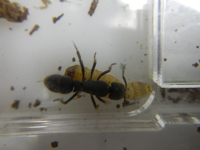 Муравьи пожарные очень любят гусениц, поэтому мне приходится выращивать для них восковую огнёвку. Я с удивлением наблюдал за одним из них, который вместо того чтобы тащить гусеницы в семью, уволок её подальше и крысятничал, то есть сам её жрал в одиночестве! А остатки отнёс потом в формикарий.