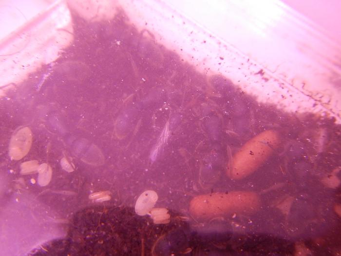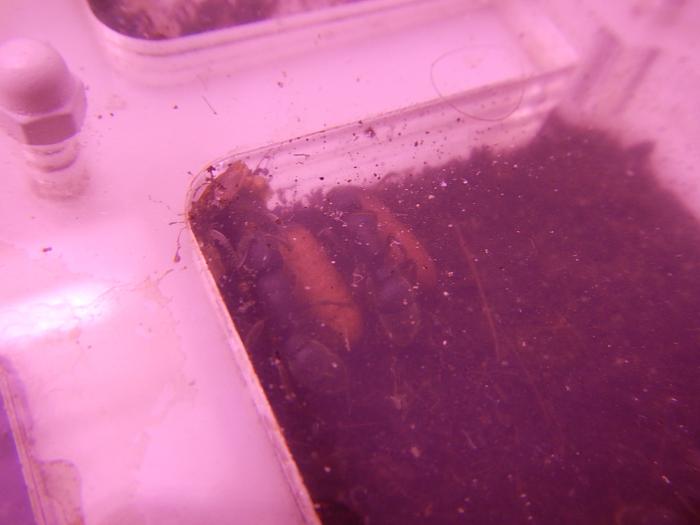 Она странная какая-то. Очень странная. На фото с мертвым рабочим я разглядел у этой матки... копулятивный орган самца! Или это неестественно вывернутое жало? На том же фото заметно, что и торакс сильно отличается от торакса рабочего, в то время как у нормальных маток он лишь немного шире. И не только торакс - брюшко и остальные детали строения тоже самцовские. Или просто сегодня заработался или...