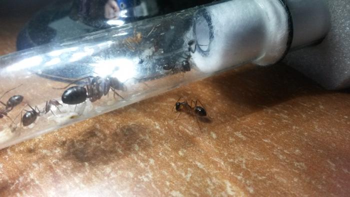 Часть расплода они перенесли в новый инкубатор, а коконы, матка и половина рабочих остались сидеть в старом...прождав более суток, решила все-таки им "помочь" и использовать в этом деле "волшебный пендель"-нагнула пробирку и начала постукивать по ней. Конечно, такой наглости от меня никто не ожидал и матка, еще чуть посопротивлявшись, все же переехала на новое место жительства.