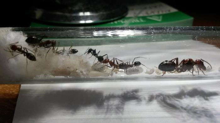 ну вот кстати мое субъективное сравнение скоростей бегунка и феллаха- бегунков убежавших при "монтировании" арены и переселении я более менее легко ловила ваткой, а феллах как-то убегал-даже прицелится не могла- скакал и по столу и по стене и по полу с бешенной скоростью, хотя зависит видимо еще от роли муравья, ибо некоторые( видимо няньки) выбежав из формикария, сидят практически на месте, шевелят только усиками и изучают окружающую среду, а другие(разведчики) сразу "скачут" сломя голову куда угодно вдаль)), но в итоге все равно возвращаются к дому.