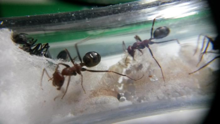 К инкубатору была подключена банка\аренка с песком, поилкой и подогревов. Чем меня поразили бегунки, так это тем, что они никогда не сидят без дела. Вот феллахи к примеру, побегают, потаскают коконы, покормят личинок, поделятся едой друг с другом и хоть ненадолго,но замирают, просто сидят и будто отдыхают. А бегунки,если и сидят на одном месте, то без остановки чистят "мордочки", усики, себе или товарищу- неважно, но все время в движении! Те недораспакованные муравьишки так и не родились...не могу сказать в чем дело, один подкидыш тоже уже умер и один самый большой родной(а может и нет, ибо ну слишком большой для этой колонии он) рабочий тоже. Расплод появляется, причем матке нравится "нестись" вися вниз головой на потолке пробирки, кроме нее так никто больше не висит)), личинки растут, шевелятся со страшной силой, они у бегунков уж очень активные и с радостью( я верю) тут самостоятельно поедали большую голову туркменского тарика. Предложенный сахарный сироп был продегустирован и закидан песком, сладкий мандаринчик с яблоком тоже. Также семейство решило, что окукливаться только с помощью песка уже не модно и стали бодренько распушать ватку и подтаскивать туда больших личинок, чтобы те уже смогли там закончить свои важные волшебные процессы превращения))