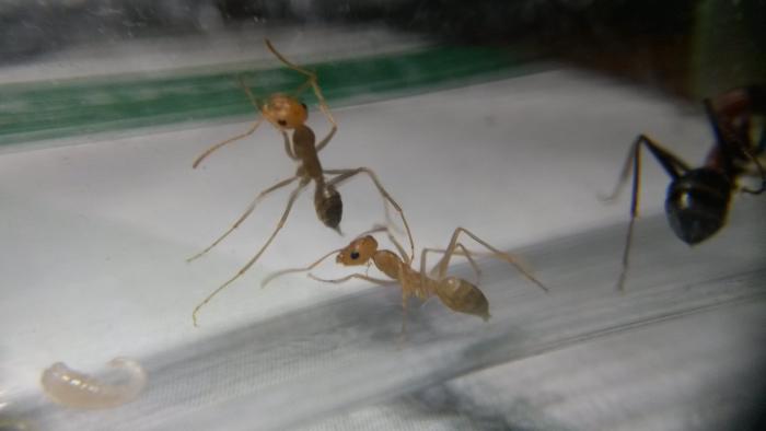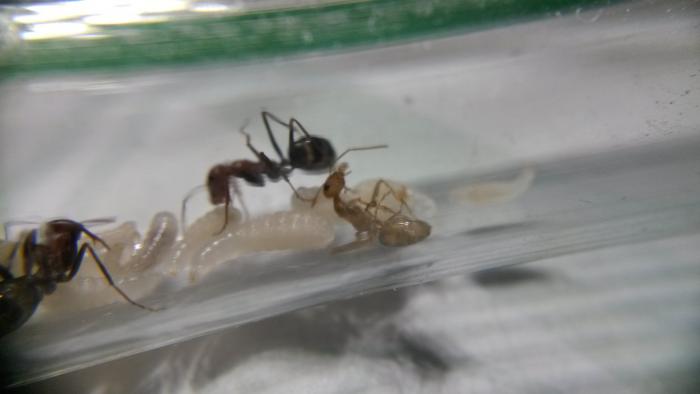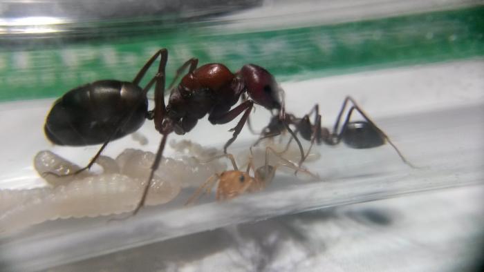 В колонии было 15 мурашей(среди них 3 подкидыша обычных бегунков), несколько коконов, личинки. Коконы выглядели высушенными, вскоре по приезду один из них начали вскрывать, делали причем это как-то быстро и резко, мне сначала показалось, что его просто рвут на кусочки и едят, но нет, все же распаковывали...На половине распаковки дело встало, и нерожденный мураш остался с коконом на брюшке...он лежал и тихонько шевелил передними лапками, а его собратья( конечно же сестры), почему-то его игнорили.
