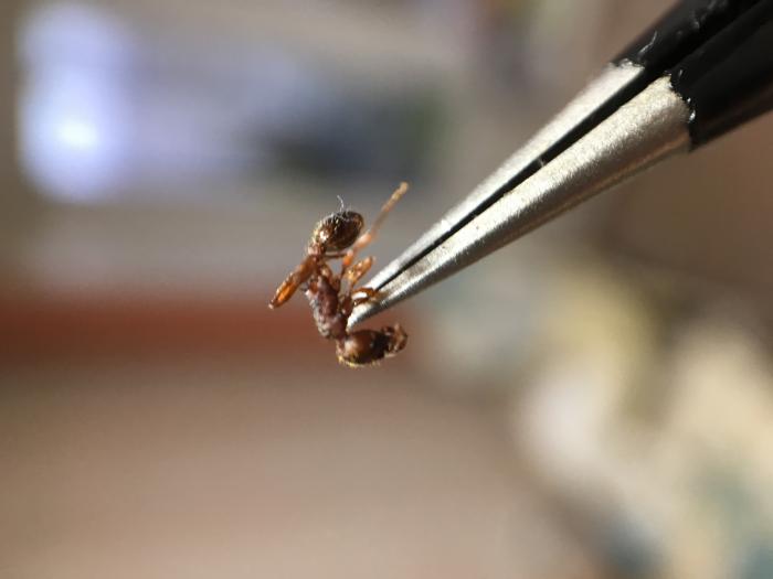 Если хотите сохранять образцы - приклеивайте муравья нижней стороной на кончик узкого длинного треугольника из плотной бумаги. При фотографировании держитесь за бумагу и не прикасайтесь к самому муравью. Треугольник из бумаги насадите на булавку, снизу - прямоугольник из бумаги с надписью, что это и откуда. И в коробку. Вот и получится коллекция.