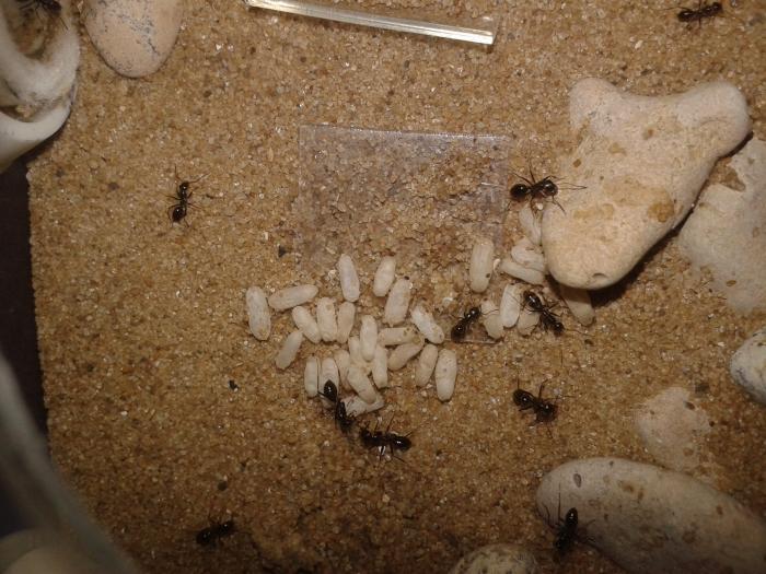 К моему удивлению яйца у бегунков оказались почти "нелипкими". Практически никогда пакет не видел целым, он всегда разваливается, чему еще помогают рабочие. Они кстати, как, например, мессоры или сервиформики, не таскают пакет одним целым, предпочитая взять в мандибулы лишь одно яйцо. Так при стрессе полколонии и таскает по 1 яичку, выглядит забавно, может смогу как-нибудь запечатлеть. Успокаиваются они тоже, на удивление, крайне быстро. Буквально через несколько секунд поняв, что им ничего не угрожает, они возвращаются к своим повседневным делам.