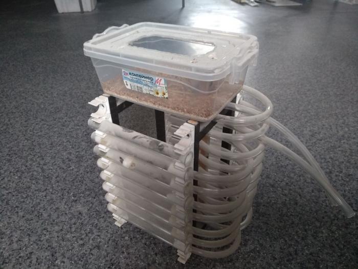 Сам контейнер будет служить просторной ареной, на стенке которой будут закреплены ряд пробирок, часть с водой, часть пустых. Надеюсь общая картина более менее понятна.
