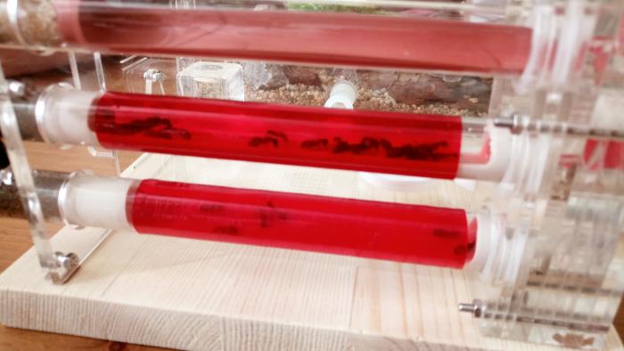 Вчера геркулианусам пришел формикарий на шесть пробирок и с небольшой ареной. Это будет техническая арена- кормить, поить. Пробирки гибридные, верхние пока перекрыты, герки сидят в тех же двух, что и были, они установлены внизу формика. Все вместе поставила на мебельный щит, чтобы переносить, передвигать, поворачивать, пыль вытирать было удобно. Соединение формика и большой арены гибкое, коротким куском толстого шланга. В отверстия (на арене расточено шире, в формикарии просверлено новое) вставлены втулки - обрезки мерных шприцов от нурофена. На втулки снаружи одет шланг, сидит плотно.