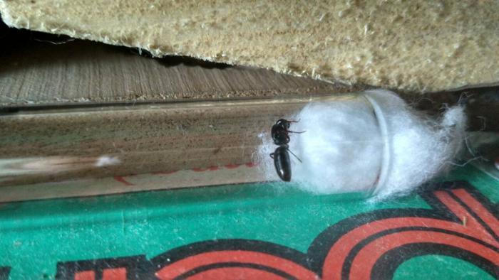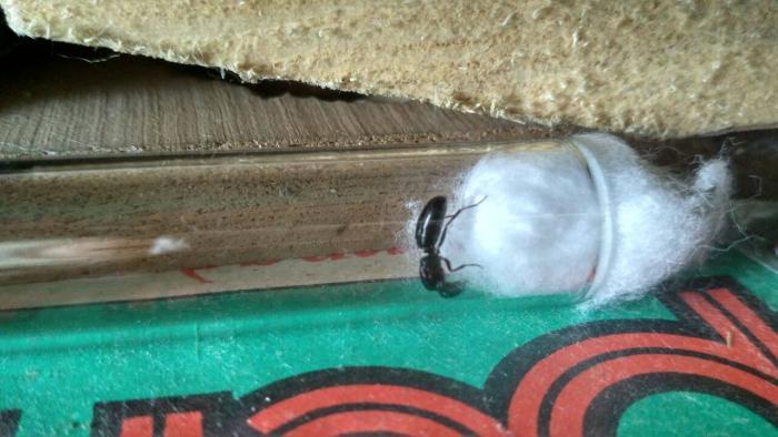 Поймал ее вчера, предположительно Camponotus herculeanus, все сделал как обычно посадил в пробирку в затемненное тихое место,вчера вела себя адекватно, села к ватке влажной, умылась и нечего не предвещало беды, сегодня заметил что что то черное у ватки мелькает, убрал картонку(создающую темноту), а она вату наплела до самой влажной ватки. Заменил пробирку, покормил ее, она все равно грызет ватку, бегает по инкубатору, психует по моему... Может у кого есть идеи что может быть не так?