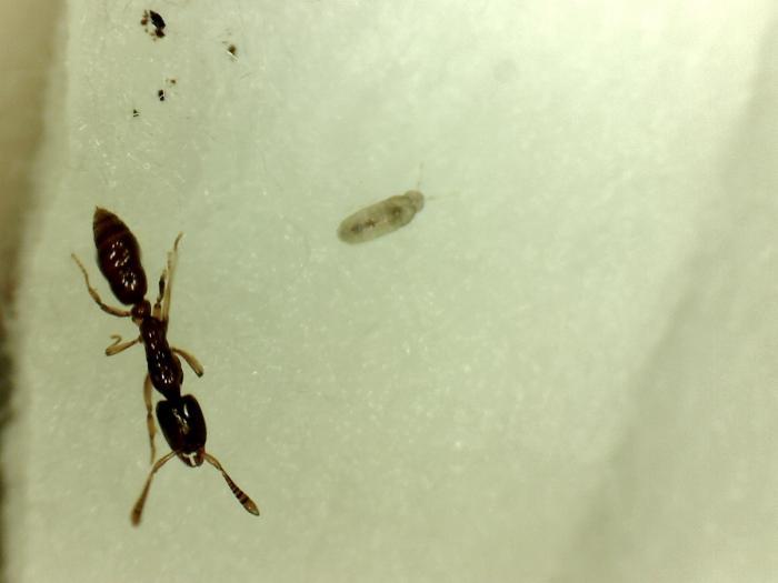 И вот решил я таки создать еще один блог. Он посвящен небольшим понеринкам, Hypoponera punctatissima. Эти понерины славятся своей инвазивностью и способностью выживать в парниках и отапливаемых помещениях, а также оплодотворением в гнезде, как у фараонов. Мое знакомство с данным видом произошло год назад, когда в зоопарке мне удалось выловить отводок этих мурашей. Поселил их в пробирку, но им там не понравилось, пришлось выпустить их в большой цветочный горшок. Но я был почти уверен, что их сожрут большие семьи тетрамориумов или лазиусов, проживающие там уже очень давно. Выпустив, я забыл о них на долгое время. И вот, спустя год, они заявили о себе, и не как маленькие примитивные понерины, а как воины-завоеватели! Впервые были замечены убытки в популяции белой карликовой мокрицы, полноправном жителе моего горшочного царства. Их популяция сократилась, хотя никто их не мог потреблять, тетры и лазиусы просто не способны осилить их броню. Поймал несколько мокриц и стал их разглядывать на наличие паразитов, но их не увидел, зато у каждой отсутствовали один или два усика или лапки, кто-то их просто отрывал. После разглядывания животинки, я стал осматривать землю и увидел их, маленьких монстриков, которые брали, хватали мокричек за усы и не отпускали, пока не получали вкусный и питательный кусок. Дальше было хуже, пострадали все жители горшка. Понеринки сожрали все куколки тропических жуков бронзовок, которые с успехом размножались в моем горшке, съели их изнутри, искоренили лазиусов!!! Просто хватали и сжирали их на глазах. Через несколько дней срочно эвакуировалась в соседний горшок тетра, подгоняемая «веником»!! Все муравьи горшка были либо сожраны, либо прогнаны понериной. Hypoponera punctatissima стала единственным муравьем и полноправным владельцем этой экосистемы. Пищи стало маловато, поэтому я их начал подкармливать тараканчиками и разными личинками. Их фуражировка поражает образованием устойчивых троп. Муравьи выедают весь корм изнутри. Сейчас плодят огромное количество крылатых самок. Самцов очень трудно обнаружить, т.к. они бескрылы и очень смахивают на рабочих, но одного мне удалось поймать. Ещё недавно выловил огромный отводок с пятью бескрылыми и 6 крылатыми самками, с кучей расплода на разных стадиях, они приютились в прикопанном маленьком горшочке.