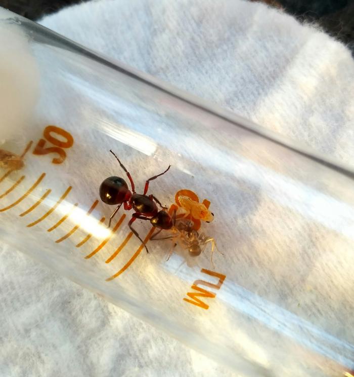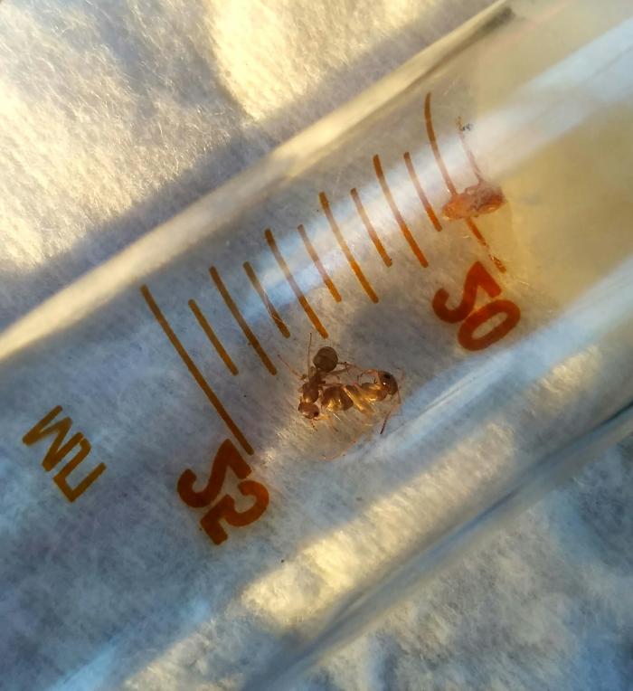 Я посадила матку и несколько рабочих в пробирку с субстратом из мелких щепок, и матка отложила пару яиц, за которыми ухаживает один из рабочих)
