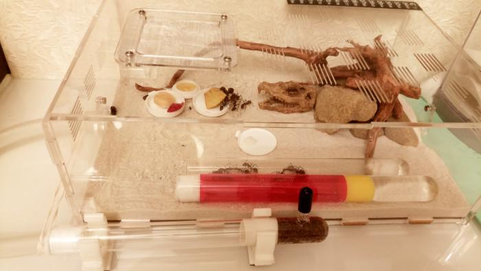 Эх.... Обнять и плакать... Сидят на арене грустные. Разделились на две группки, одна у яблока, другая в пробирке старой. Две новые пробирки предоставила, одна гибридная через 14мм шланг, другая прямо рядом со старой на арене... пару раз сходили и все.