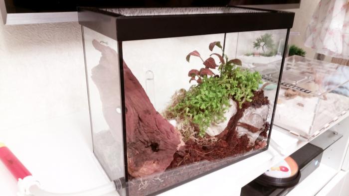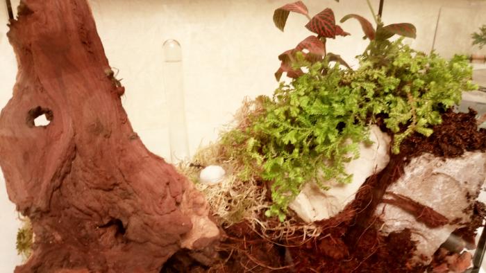 30х15х25, мангровая коряга, камни, растюхи, кокос, кора, торф, мох... Пробирка двадцатка отдельно за гнездо. Сделаю ещё гнездо гипсовое небольшое, пару камер крупных . Заказала светодиодную ленту и сетку на АлиЭкспресс, доделаю позже крышку и подсветку.