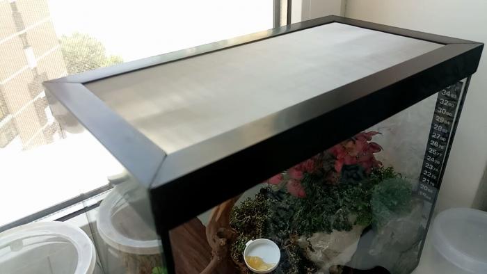 Рама крышки лежит сверху, из черного пластикового уголка сделала. Сетку вставить и готово.