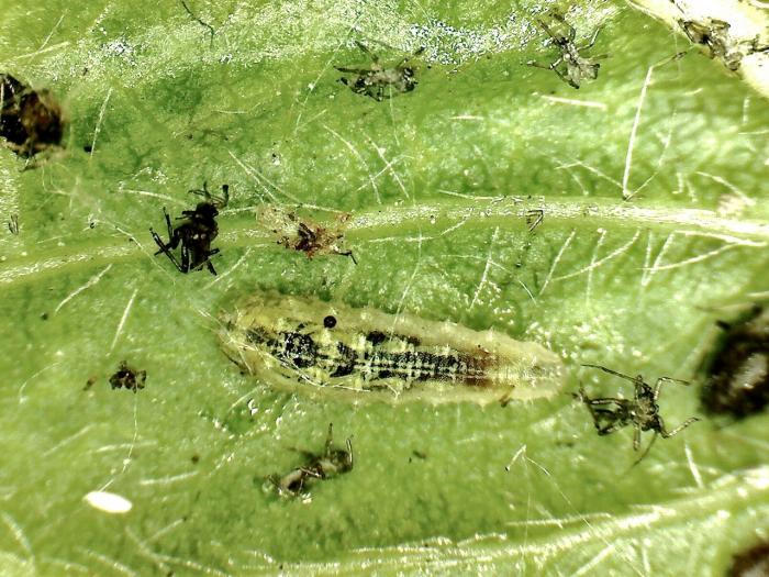 Принес я домой пару веточек с тлей и пофотографировал на свой микроскоп. Увидел процесс рождения малыша. Часть этого процесса на первом фото. А на втором фото грозный хищник - личинка мухи журчалки.