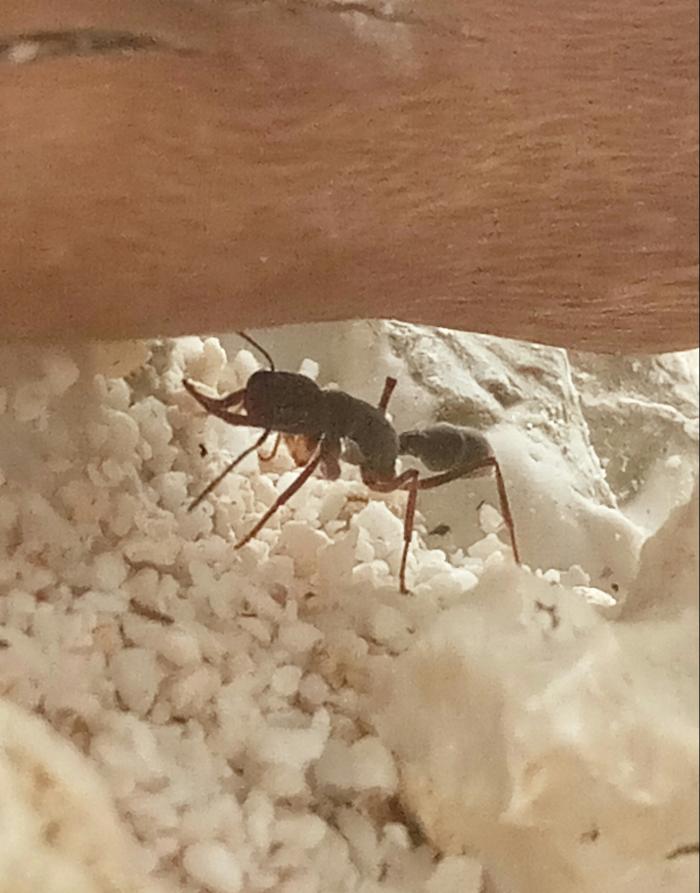 Осталось пять мурашек, четыре яйца позавчера видела. Клещи есть, но мало. Нифига не едят. Муху и сверчка выкинули на арену, сегодня мраморник валяется посередине. То ли убили, то ли сдох. Где-то по углам ещё два бегают , большой и маленький. Вижу примерно раз в день патрульную мурашку, ходит по периметру арены. Фотки ниже.