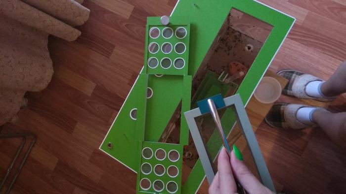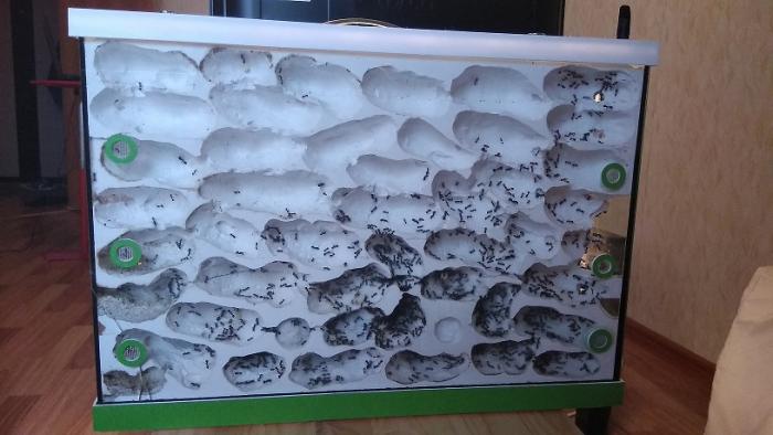 1. Количество муравьев порядка 2000 я предполагаю, да в формикарии им просторно, перегородок не предусмотрено,но катастрофичного замусоривания не замечено(прилагаю фото). В формикарии есть камеры которые обзору не подлежат, я это делала для того, чтобы муравьям было комфортнее (более реалистичные условия), поэтому конечно, матка расположилась где то в этих необозреваемых камерах, но то что она жива и действует можно понять по наличию личинок и куколок, которых муравьи таскают на самые верхние и сухие уровни. Когда свет включен, то он светит только внутри, получается задние камеры не засвечиваются и муравьям там комфортно. Еще я предполагала подсветку для более эффектной демонстрации друзьям или просто в моменты когда хочется поразглядывать муравьев, но не на постоянной основе.