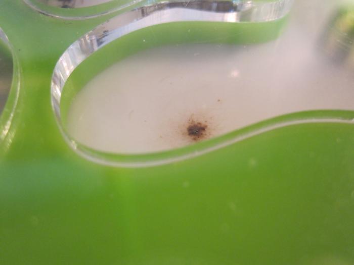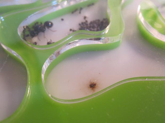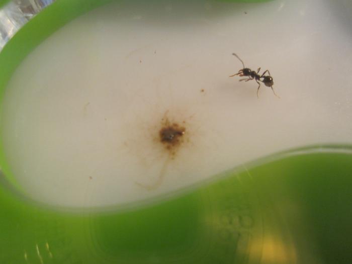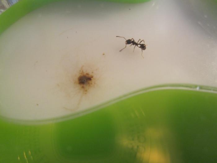 Недавно переселил муравьев мессоров из инкубатора в новый формикарий. На тот момент было 15р+1 матка и куча расплода. Через 2 дня я решил попытаться подселить куколку-сиротку. Матка её не приняла: убила, съела. Ещё через 1-2 дня в формике появилось маленькое коричневое пятно (диаметр примерно 5-7мм). Что это за пятно?