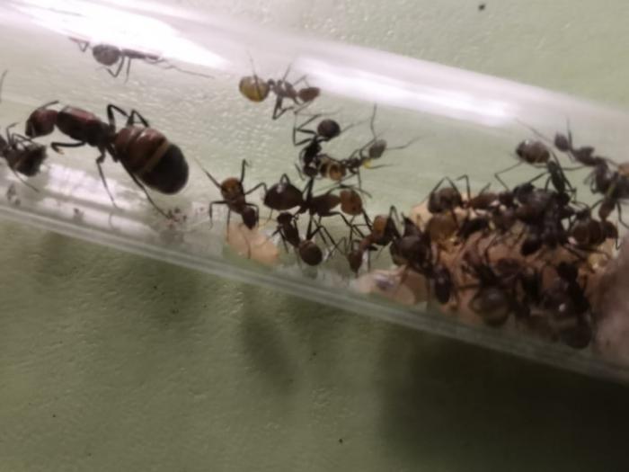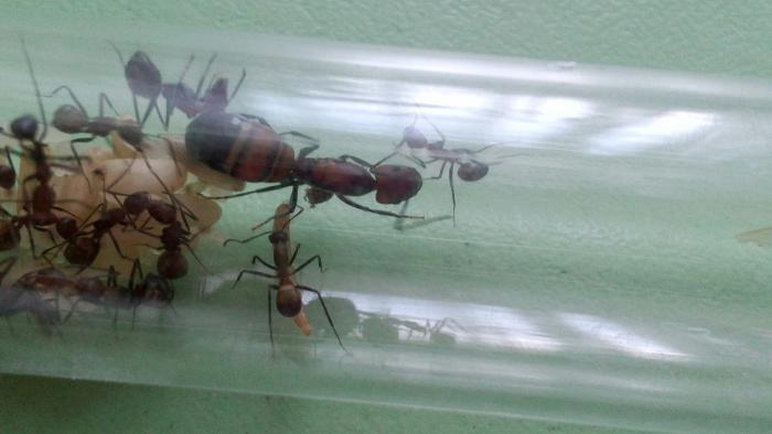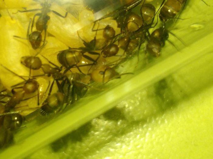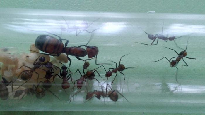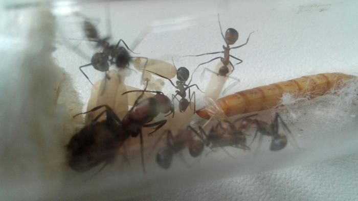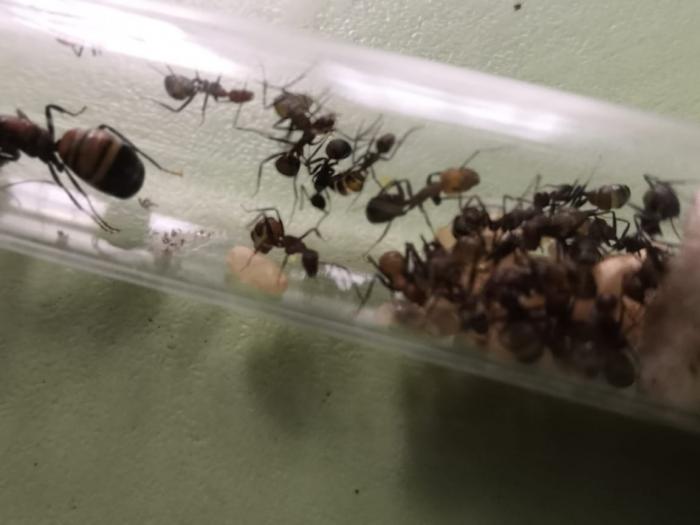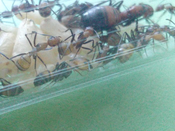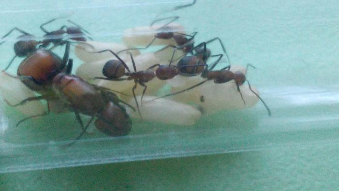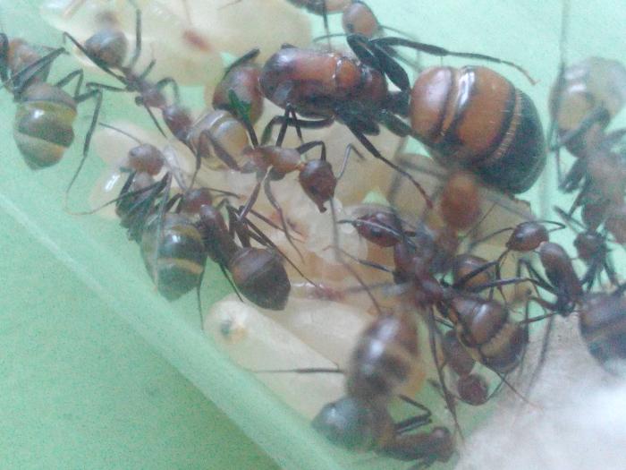 Сейчас в колонии 1 матка, 8 рабочих, 13 коконов, кучка яиц и личинок.