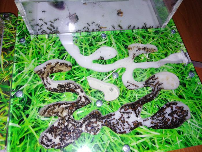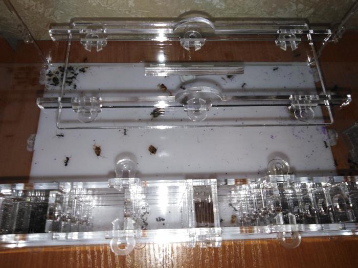 Ники полностью заполнили оба формикария и имели горы расплода. Зрел вопрос о переселение. И был у меня в закромах акриловый горизонтальный формик, правда, не особо удачный, но тогда я этого ещё не знал. Переселение шло туго, часть муравьёв погибла. А позже оказалось, что влажность там не держалась и расплод не развивался. Ситуация была плачевной.