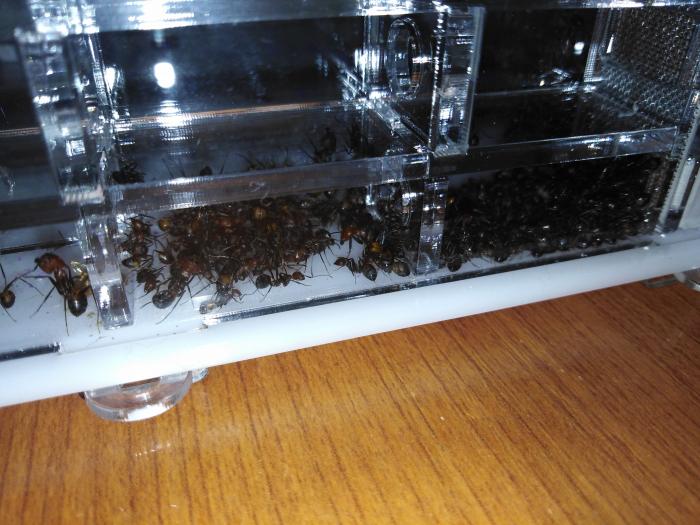 Теперь перейдём к поведению. Муравей очень спокойный. Разве что наглый туркмен может их вывести из себя. Охота у них, конечно, не важная, но это они компенсируют тихой суетой в гнезде. Особенно мне нравится наблюдать за передвижением по трубке из одного гнезда в другое. Кстати, во втором модуле находится около 100 мурашей, но учитывая количество яиц, через месяц - два он будет полон
