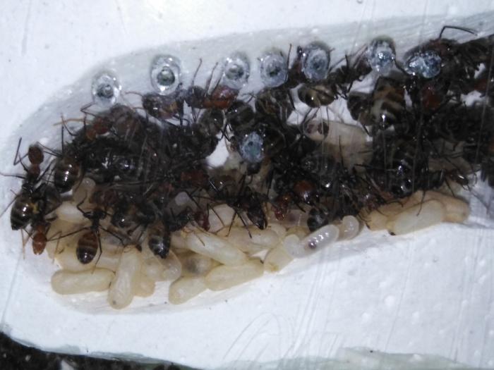 Вчера вечером удалось отлично разглядеть кучку расплода, которую обычно со всех сторон окружают муравьи. Личинки начали окукливаться, и появились новые яйца и мелкие личинки. НикЗавод, наконец - то, восстановлен.