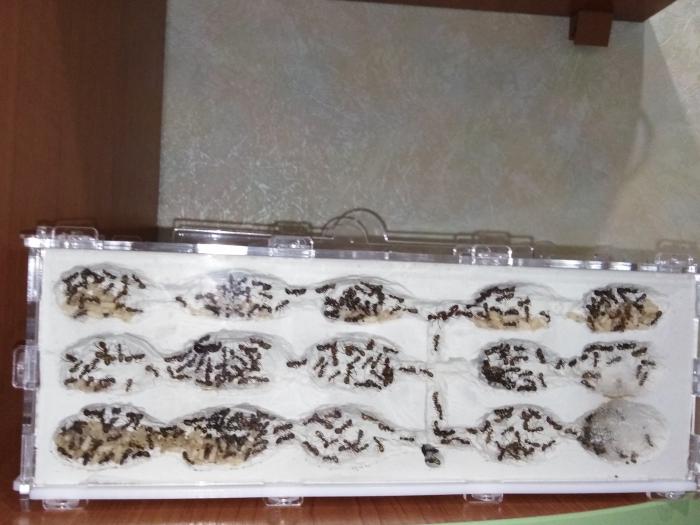 Сейчас в колонии 1 матка, 8 рабочих, 13 коконов, кучка яиц и личинок.