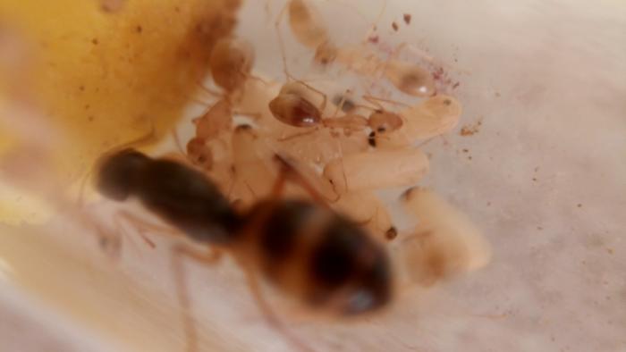 Матка коричневой формы, не робкая (сравниваю с другими, у меня их несколько), активная , агрессивная. Ну и мурахи ей под стать. Возможно поэтому из трёх моих турок эта семья развивается быстрее всего. У той, что приехала месяцем раньше с пятью рабочими и расплодом сейчас только шесть рабочих и расплод. А эта матка приехала одна с расплодом. Сожрала в процессе развития двух подкинутых никобаренсиса и трёх своих рабочих. И не смотря на это, семья развивается быстрее. Сейчас рабочих 12 , десяток коконов плюс личинки и яйца. Это на сегодня, к моменту продажи их может уже быть больше. Кажется эта семья преодолела самые первые сложности и уже на рельсах стабильного начала. Я за них спокойна, можно отпускать.